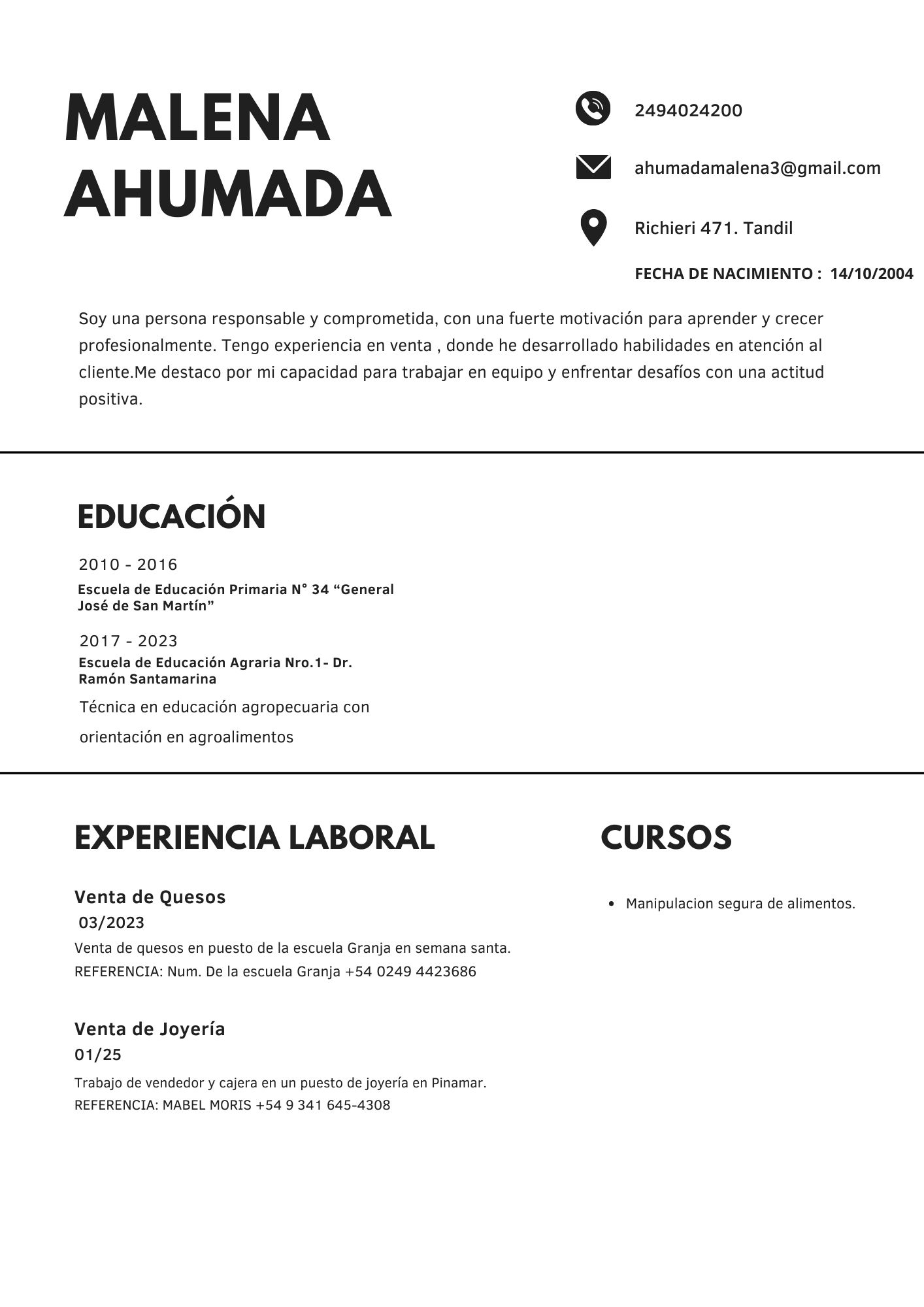| Malena Ahumada | 2494024200 | ahumadamalena3@gmailcom | Tec en Prod Agropecuaria – Orientación Agroalimentos | https://exalumnosgranja.com.ar/wp-content/uploads/2025/11/CV-Malena-Ahumada.jpg |